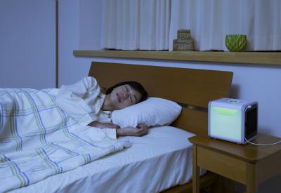 風量は3段階に調節可能で、気分にあわせて使える「LEDムードライト」も搭載。さらに音が小さい低騒音設計※6で、最長8時間※7の連続使用ができ、就寝時にもおススメです。エアコンによる冷えなどでお悩みの方も、ここひえなら自然界の空気冷却と同じ仕組みだから、優しく心地よい涼しさで、熟睡をサポートします。